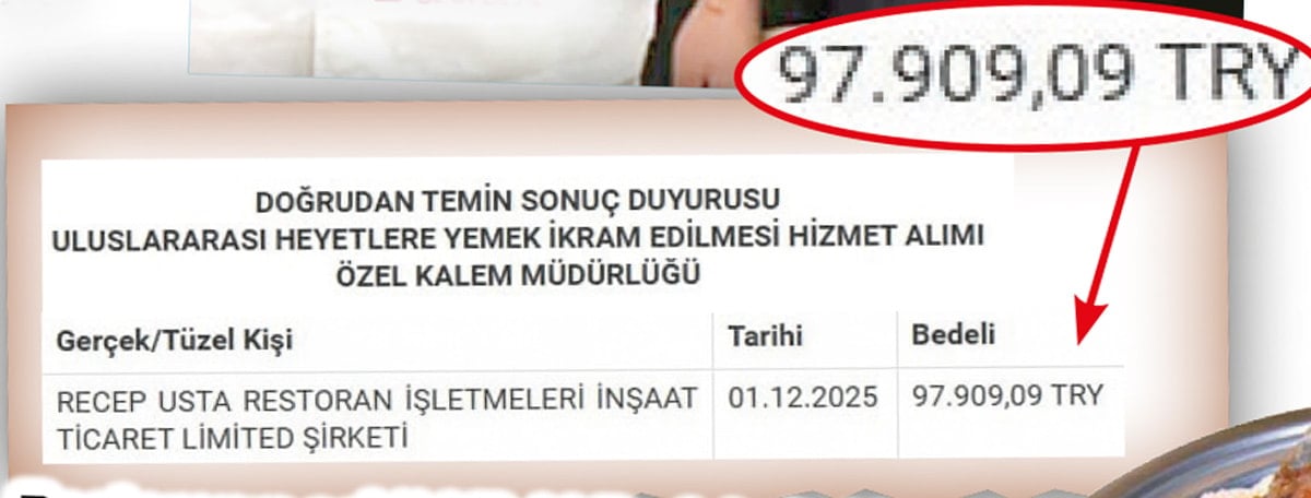 Son olarak KKTC’den gelen Çalışma ve Sosyal Güvenlik Bakanı Oğuzhan Hasipoğlu ile 12 kişilik heyet de meşhur Tavacı Recep Usta’da ağırlandı. Mekanda bir gecelik yemek için 97 bin 909 TL (yani 4.5 asgari ücret) fatura edildi. Yemeğe kaç kişinin katıldığı ise açıklanmadı. Bakanlığın Mayıs ayında Azerbaycan heyetine Recep Usta’da verdiği yemeğin maliyeti de 30 bin liraydı.  Maliye Bakanı Mehmet Şimşek’in de Tavacı Recep Usta’ya gittiği kamuoyuna yansımıştı.
