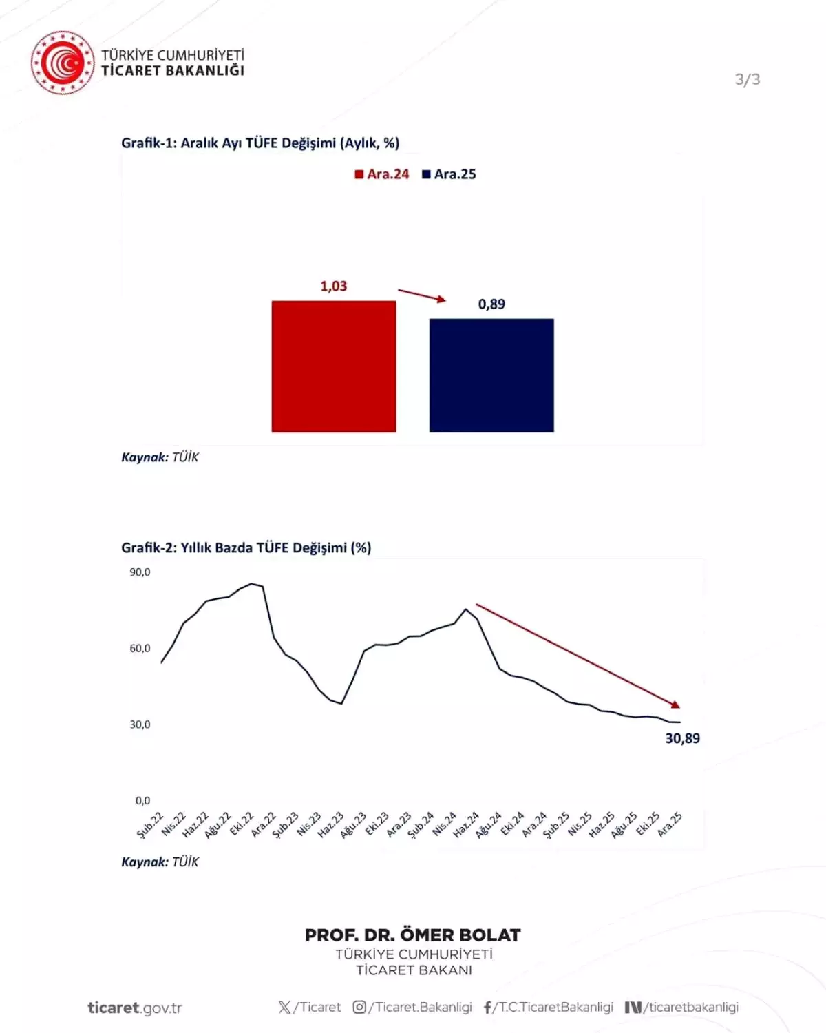 Ticaret Bakanı Ömer Bolat, yıllık enflasyonun Aralık ayında yüzde 30,89’a gerileyerek son 49 ayın en düşük seviyesine indiğini açıkladı. Bakan Bolat, ekonomik büyüme, istihdam artışı, ihracat artışı ve cari işlemlerdeki dengeli görünümle birlikte enflasyonda görülen gerilemenin Türkiye ekonomisinde toparlanma ve dengelenme sürecinin başarıyla devam ettiğini belirtti.