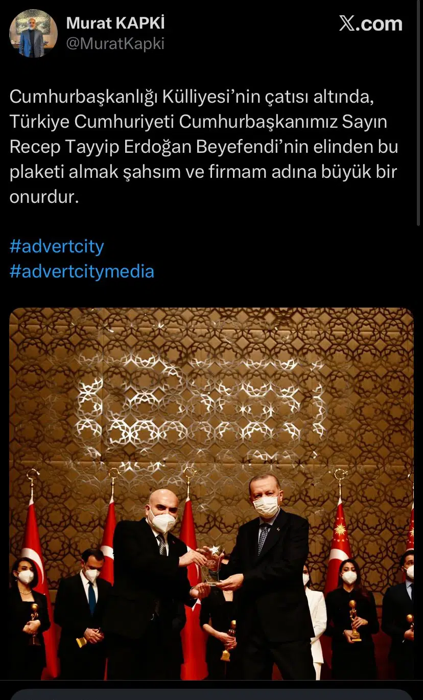 İsminin “Sayın Murat Kapki” şeklinde anons edilmesinin ardından sahneye çıkan Kapki, plaketini bizzat Erdoğan’ın elinden aldı. O esnada çekilen fotoğrafını ise sosyal medya hesabından bir not ile paylaştı.