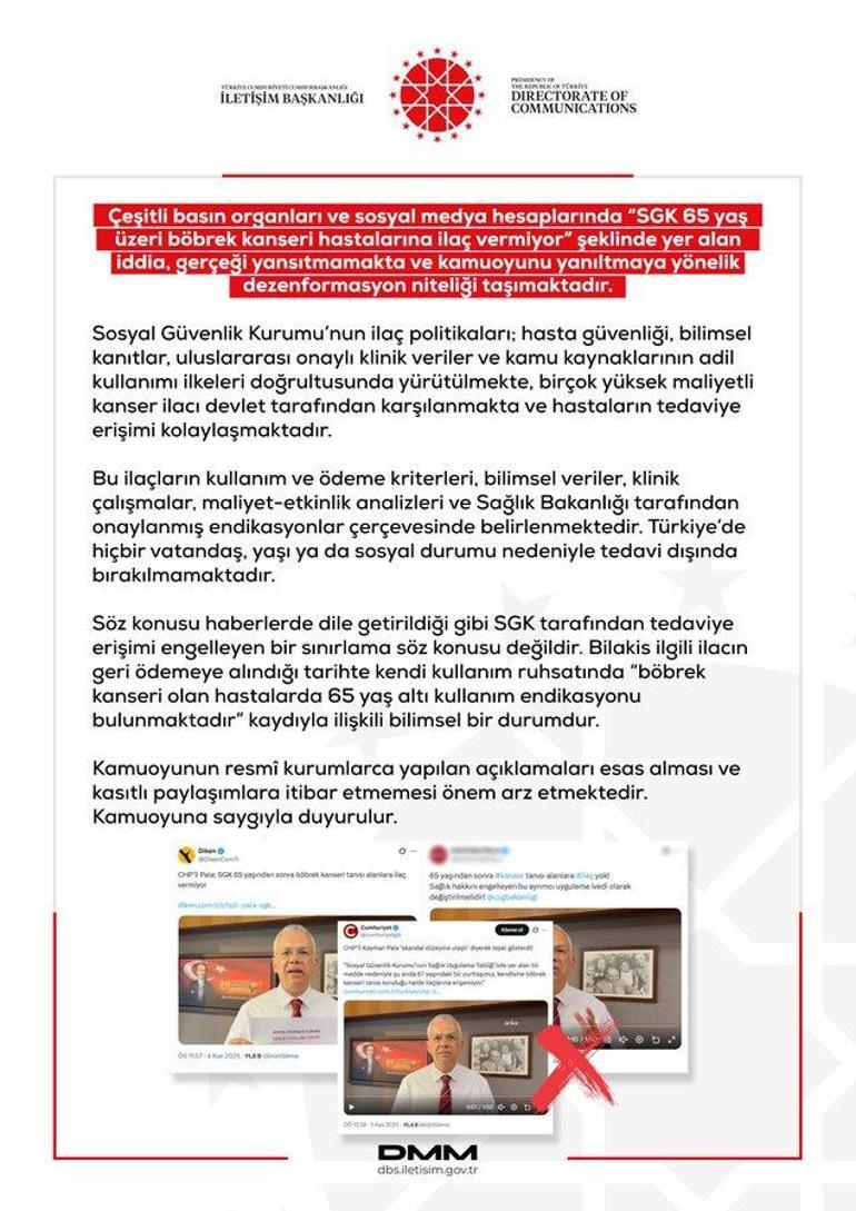 “Çeşitli basın organları ve sosyal medya hesaplarında “SGK 65 yaş üzeri böbrek kanseri hastalarına ilaç vermiyor” şeklinde yer alan iddia, gerçeği yansıtmamakta ve kamuoyunu yanıltmaya yönelik dezenformasyon niteliği taşımaktadır.