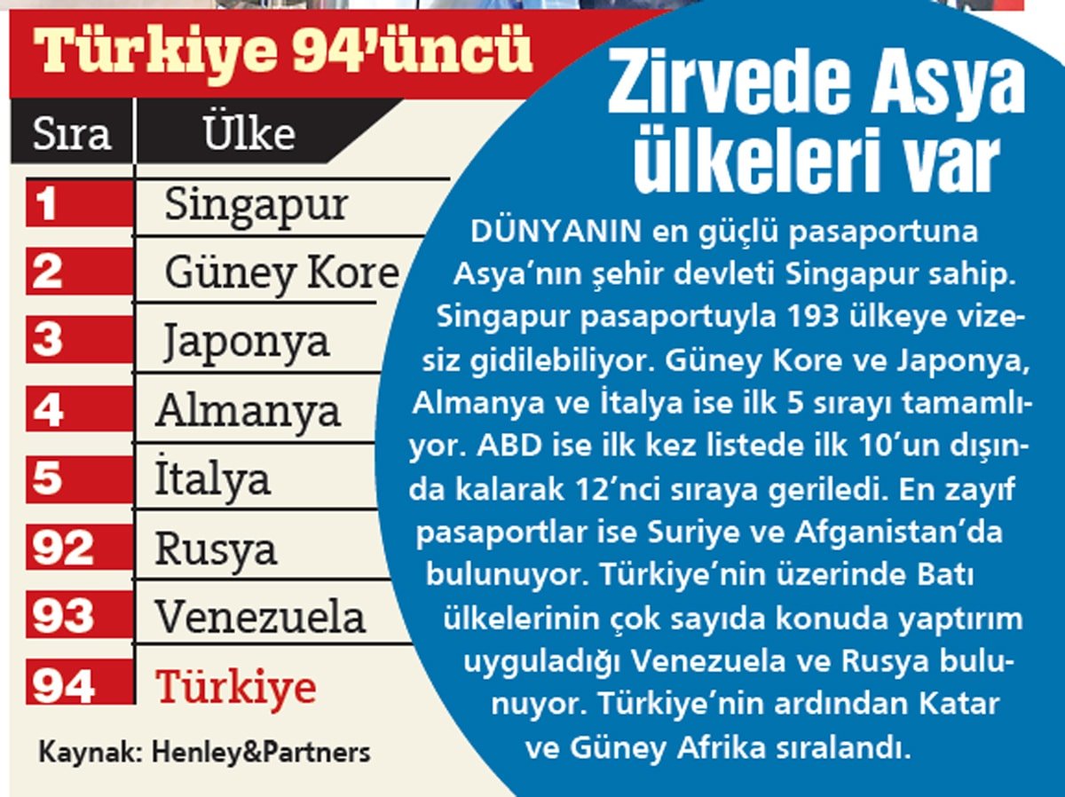 İŞ insanlarından sporculara, genci, yaşlısı milyonlarca insan haftalarca vize sırası beklerken, Türkiye Cumhuriyeti’nin pasaportunun gücü zayıflamaya devam ediyor. Vizesiz gidilebilen ülkelerin sayısı azaldı, Türkiye’nin pasaportu, ağır yaptırımlara maruz kalan Rusya’nın ve Venezuela’nın bile arkasında kaldı.